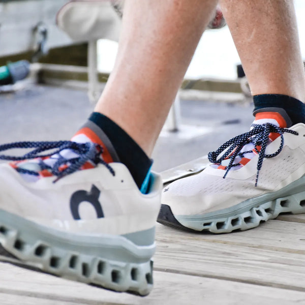 Our fibers wick moisture away from your skin and can absorb around 30% of their weight before you feel wet. This moisture is then released from the fabric through evaporation. Our technology enhances this natural moisture movement and will not allow the socks to become wet and heavy.